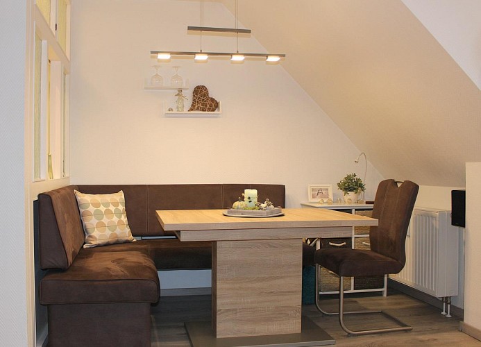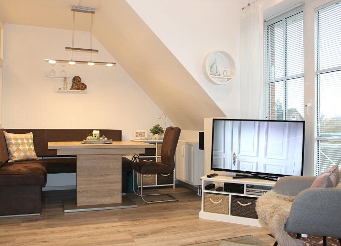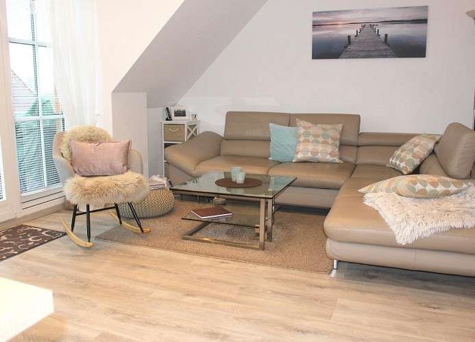 Untere Etage: Das Wohnzimmer verfügt über eine Ledersofalandschaft mit Schlaffunktion (Liegefläche 1,30 m x 2,00 m), großer 42" Flatscreen/Kabel-TV mit DVD-Player, Musikanlage (Radio, CD, Bluetooth), kostenfreies W-LAN und Telefonflat ins bundesdeutsche Festnetz. Zugang zum Süd- Balkon, der ausgestattet ist mit 4 Hochlehnstühlen, kleinem Tisch, elektrische Markise und Einbauleuchten.
