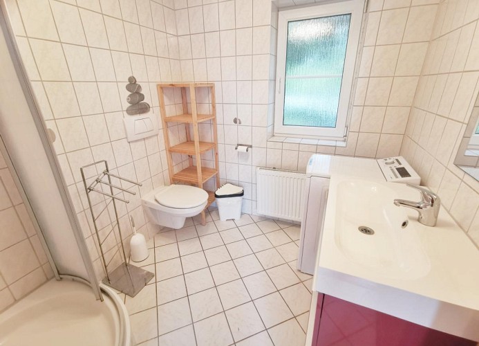 1 Tageslicht-Duschbad/WC und Waschmaschine. Vom Wohnzimmer führt eine Treppe ins Obergeschoss.