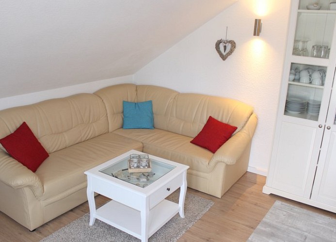 Sie verfügt über ein helles und gemütliches Wohnzimmer mit moderner Couchgarnitur, SAT-TV/ Flachbildschirm, kostenfreies WLAN, Stereo-Musikanlage mit CD-Player, DVD-Player mit Zugang zum großen möblierten Balkon, Grillen ist erlaubt.